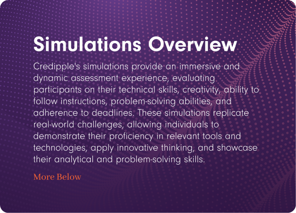Credipple’s simulations provide an immersive and dynamic assessment experience, evaluating participants on their technical skills, creativity, ability to follow instructions, problem-solving abilities, and adherence to deadlines. These simulations replicate real-world challenges, allowing individuals to demonstrate their proficiency in relevant tools and technologies, apply innovative thinking, and showcase their analytical and problem-solving skills.